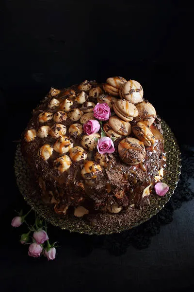 Неистово вкусна торта с кадифена текстура - забъркана с много шоколад, маскарпоне крем, фантастичен карамелен сос, френски макарони и много любов