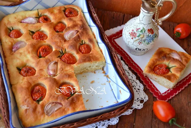 Focaccia di patate Може да сложите върху едната фокача половинки домати и скилидки чесън разрязан на две. Върху другата пресен розмарин и едра хималайска сол.