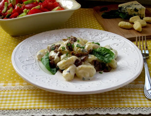 Картофени ньоки с гъби челядинки и сос от синьо сирене