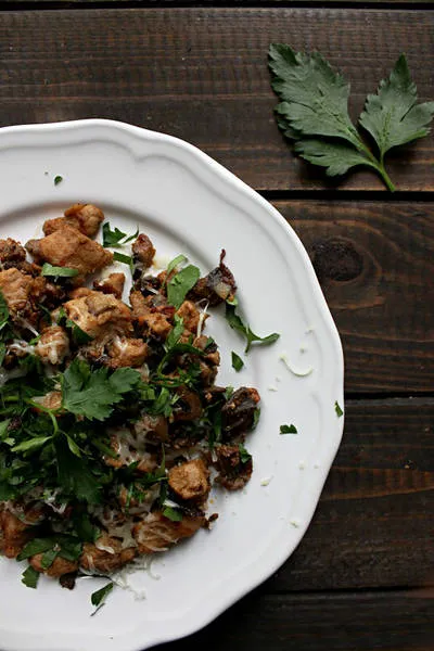 Ястието е от традиционната българска кухня. Може би най-характерно за това мезе е, че се приготвя от свинско месо, възможно и друго, дори и два-три вида. Добавят се основно гъби и лук, но често и чушки