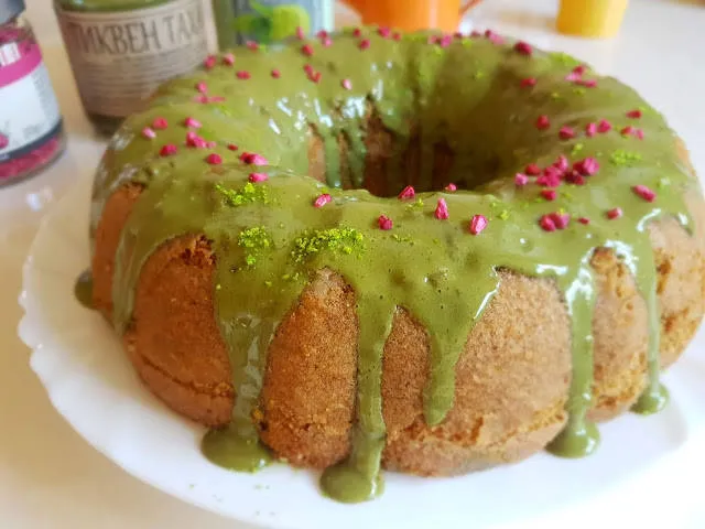 Зелен кекс със заливка от матча и тук там червенко поръсено за разкош и таха от тиквени семки (който е зелен на цвят)