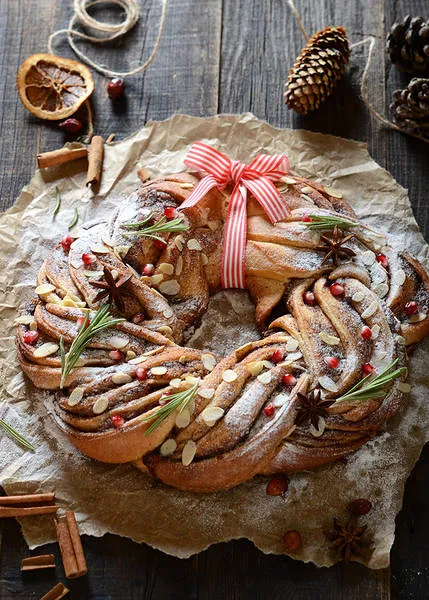 Вкусен и интересен сладък коледен венец с аромат на канела и марципан. Ще очарова гостите ви. Можете да го поднесете на закуска, за следобедния чай или с чаша греяно вино.