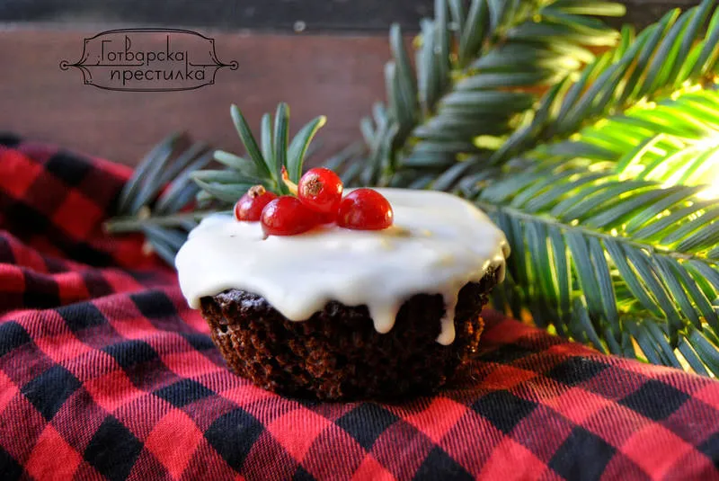 След като леко се охладят мъфините, залейте ги с глазурата и украсете с касис.