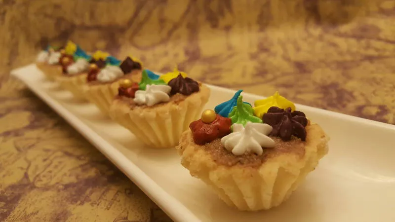 Хрупкава кошничка от захарно тесто, напълнена с нежен орехово-какаов пълнеж и декорирана с белтъчна глазура