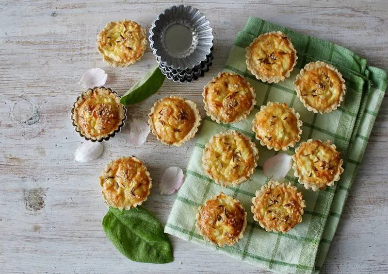 Тестото наподобява тесто за тарталети, а в пълнежа може да се добавят различни сирена и кашкавал
