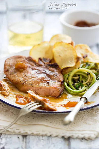 Котлети с манго чътни, салата от тиквички и пикантен чипс