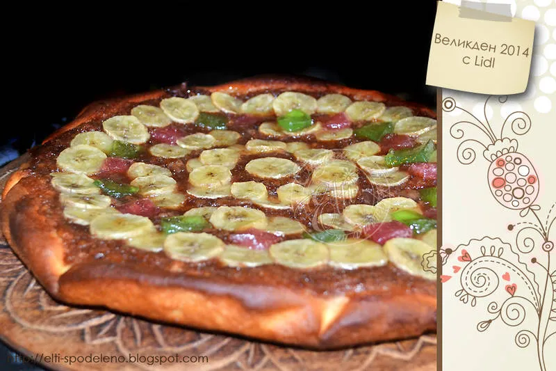 Сладка пица от козуначено тесто, шоколадов крем и банани