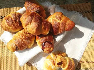 Вкусни! С плънка по ваш избор. На тези в долния край на всяка част поставяме по 1 к л течен шоколад и 1 к л орехи и завиваме на кифличка. Т
