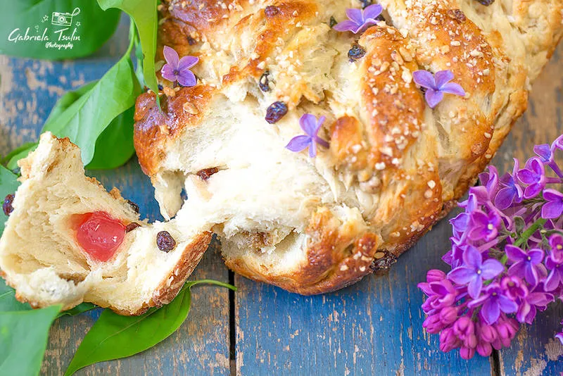 Козунак с тахан халва, локум, цитрусови корички, френско грозде, стафиди и розова вода