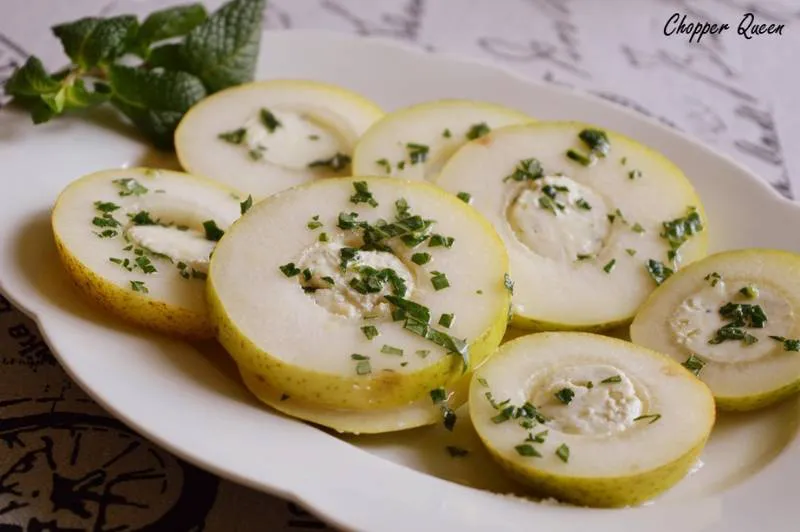 Лесно и ефекно предястие на любителите на комбинацията сирена-плодове-вино. Партнира си чудесно с добре охладено сухо бяло вино.
