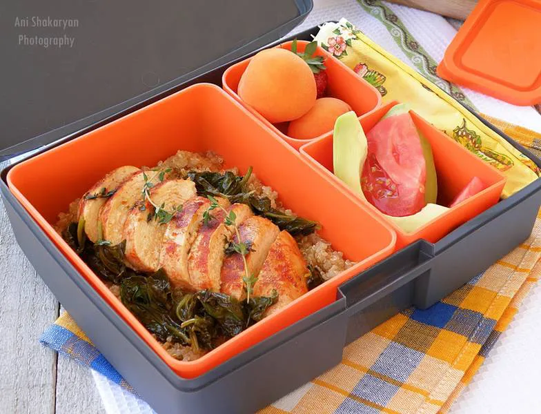 Менюто в днешната кутия с храна включва: киноа с пиле в маслено-винен сос и мащерка салата от домати и авокадо кайсии и ягода