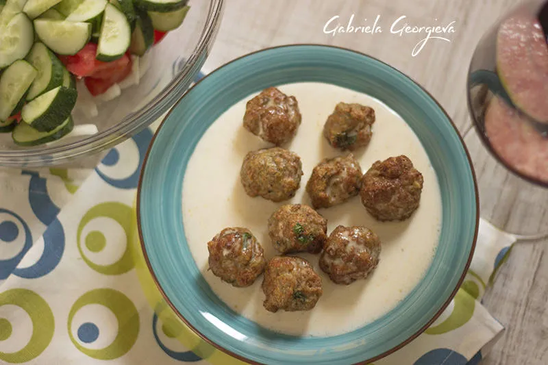 Апетитни кюфтенца по загребски, наричани още Валюшници. Поднесени са с плътен сметанов сос, свежа салата и чаша червено вино.