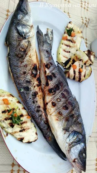 Лаврак на скара с гриловани тиквички