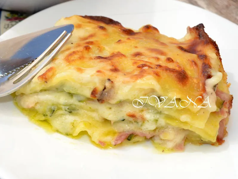 Лазаня с тиквички, шунка и скаморца