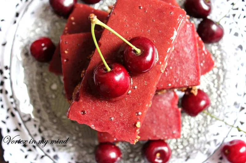 Десерт без захар и животински продукти. Преди да разрежем блокчетата е добре да изчакаме няколко минути. Може да се използват други плодове, вместо черешите