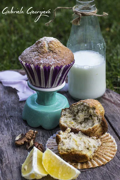 Въздушни и ароматни кексчета. Лимонов аромат и млечна пухкавина, примесени с облачни парченца орехи.