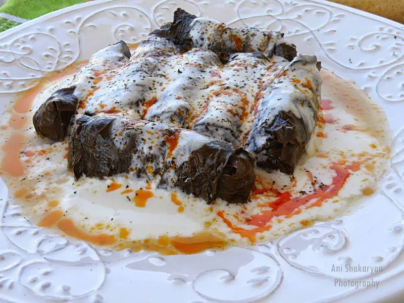 Ето какво ви предлагам да приготвите за вечеря. Лозови сърми с месо и ориз, в млечно-чеснов сос, поляти със стопено масло с червен пипер и поръсени с джоджен. Обещавам ви, че ще си оближете пръстите!