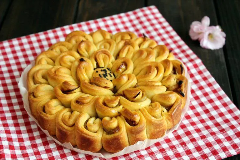 Рецепта за Цветница. Оформянето е известно в кулинарните среди като Пирог Хризантема. Много красиво оформен и поднесен!