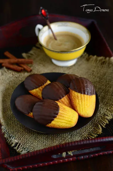 Потопете до половината всяка Мадлена в шоколада и ги подредете в тавичка, докато се охлади и стегне.