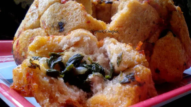 Маймунски хляб със плънка от спанак и кромид и овалян в лютеница и чесън