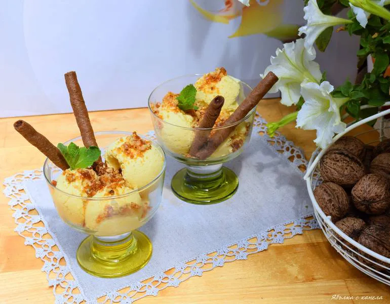Лека и свежа тропическа наслада. Сладоледът се сервира поръсен с орехов крокан и листенца мента.