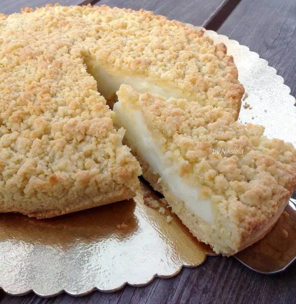 - Дъното на форма, покрита с хартия за печене , се покрива с 1 / 2 от маслените трохи. Заглажда се леко. Отгоре се разпределя охладеният крем , оставяйки малък борд, а върху него равномерно останалите маслени трохи.