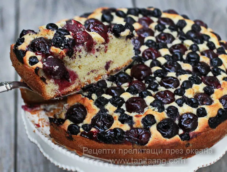 По желание може да поръсите сладкиша с пудра захар, особено ако използвате вишни или други по-кисели плодове.