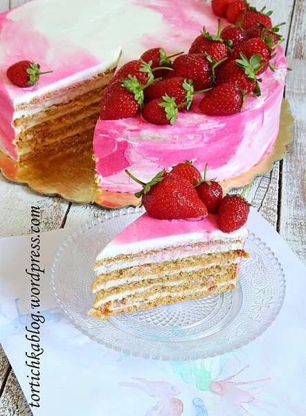 Много красива и ефектна торта, с медени блатове, крем с цедено кисело мляко... Накрая украсете с пресни ягоди.