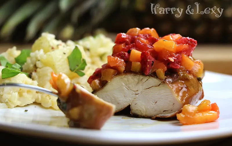 Медени пилешки гърди със салса от манго и ягоди