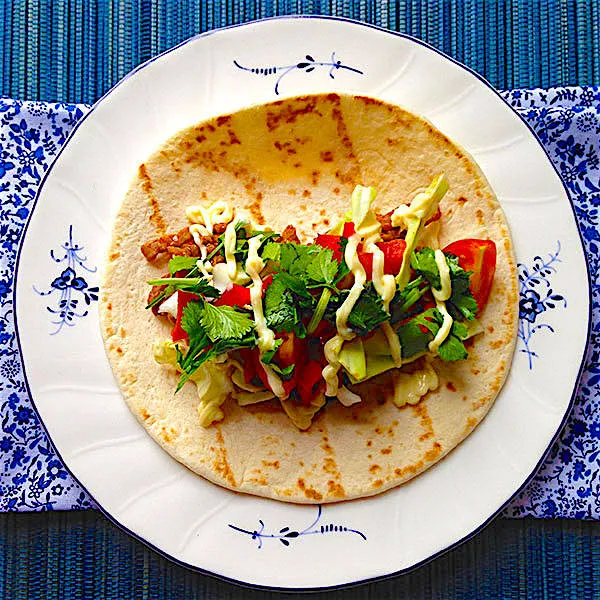 Мексикански такос, сервирани с мариновано телешко, зелева салата, домати и червен пипер, освежени с пресен кориандър и сатенено гладка маьонеза
