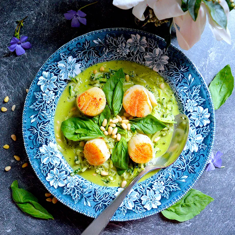 Миди Сен Жак със спирели от тиквички в босилеково песто.
