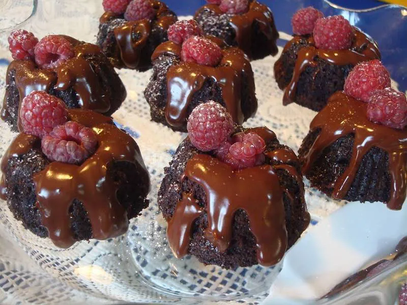 Една много шоколадова идея за малки тортички, апетитно залети с шоколад и украсени с няколко малини