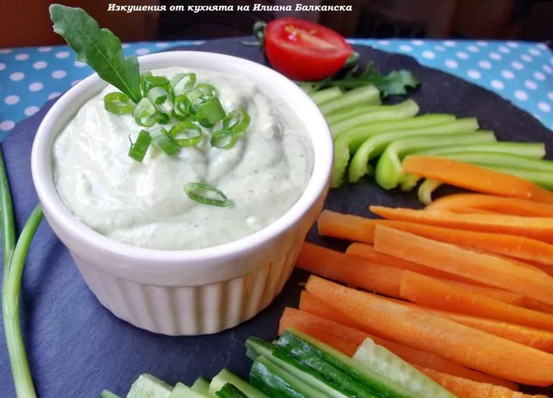 Готовият дип се сипва в подходяща купичка и се поднася с нарязани на тънки пръчици свежи краставички, моркови, чушки, тиквички и други