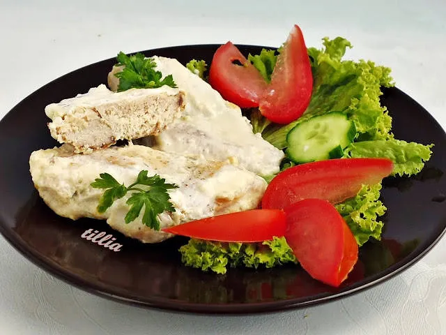- (използвах 500 г филета; сол и шарена сол; 200 мл течна готварска сметана)