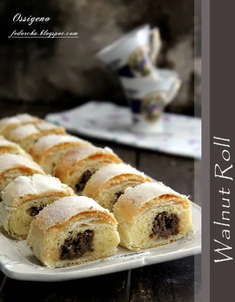 Когато рулата изстинат напълно, режем парченца от тях, така получаваме нещо като сладки. Многолистно руло с кексов и орехов пълнеж