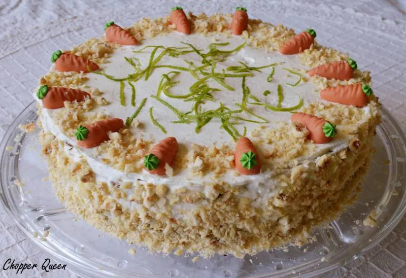 Преди поднасяне се декорира с натрошените лешници, кората от лайм и марципановите морковчета.