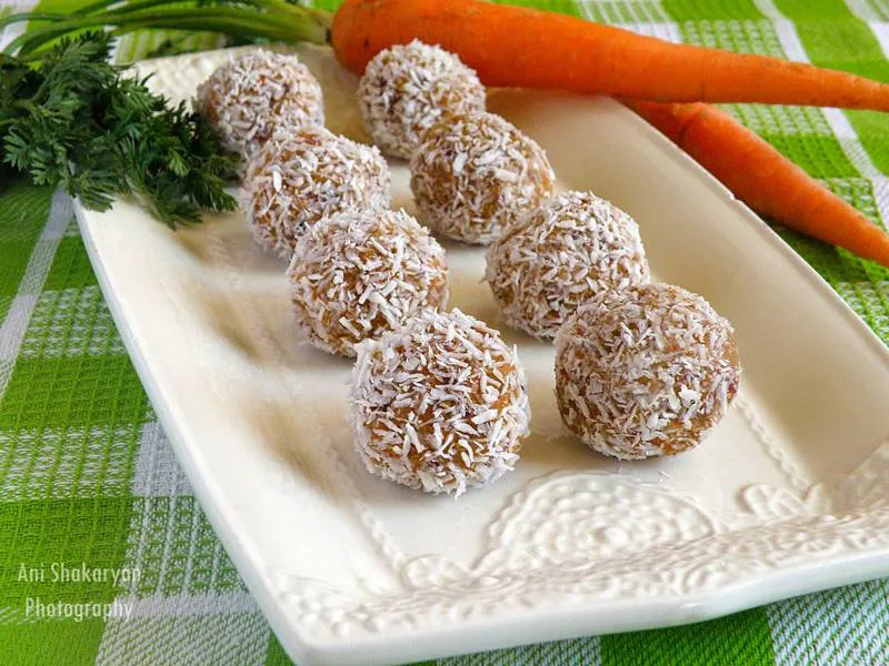 Здравослони бонбони - мисия възможна! моркови, сушени плодове, бадеми, мед, обвити в кокос