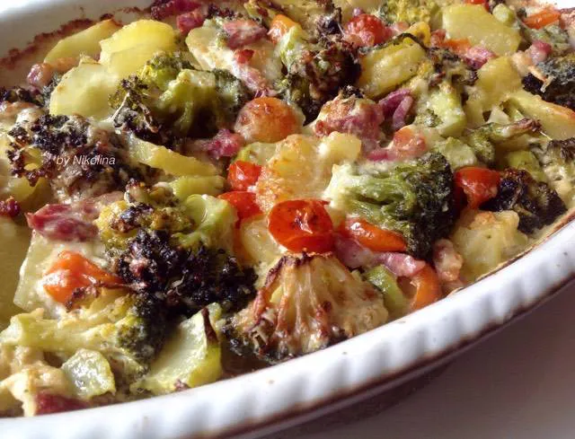 Запеканка с картофено пюре, броколи, моркови и чушки