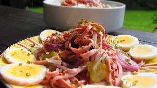 Тази салата се приготвя от Fleischwurst - телешки салам, който се нарязва на тънки лентички. В немските магазини се продава дори готово нарязан салам за тази салата. Много е популярна!