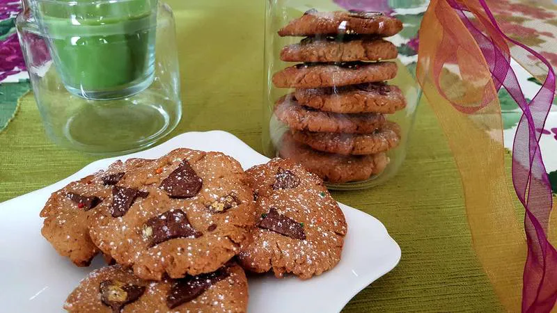 Хрупкави, топящи се в устата орехови меденки с парченца шоколад - бързи, лесни и изумително вкусни. Печете 10 минути на 180 градуса.
