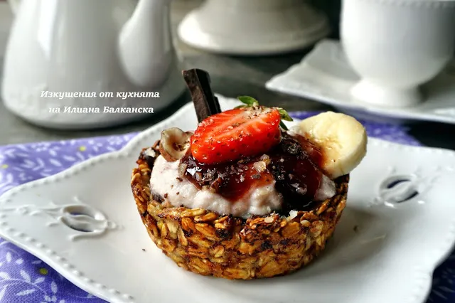 Овесено-бананови кошнички с рикота и сладко от ягоди