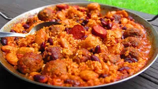 Паеля в комбинация от малки кюфтенца, бял боб, червен боб, чоризо - испански лют колбас и разбира се - задължителният ориз за паеля.