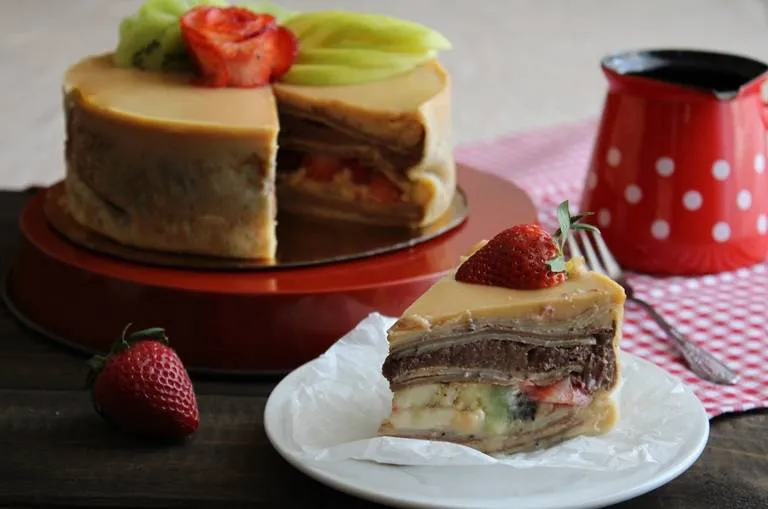 Палачинки, мусовете са два - шоколадов и карамелен, плодовата плънка е със свежи плодове - киви, ягода, банан. Декорацията е с мус и плодови рози