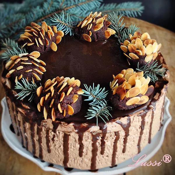 Палачинкова торта с нежен, истински, домашно приготвен шоколадов мус и приказна украса от шоколадови шишарки
