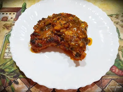 Панирани котлети на фурна в сос от домати със зелен лук и чесън