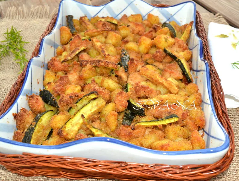Панирани пилешки хапки, картофи и тиквички на фурна