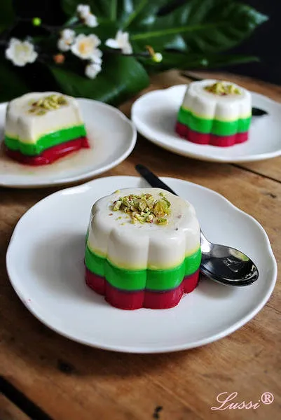 Една много вкусна панакота с бял шоколад, която оцветих като нашето знаме - бяло, зелено, червено. Залях с малко био сироп от рози и шам фъстък преди поднасяне