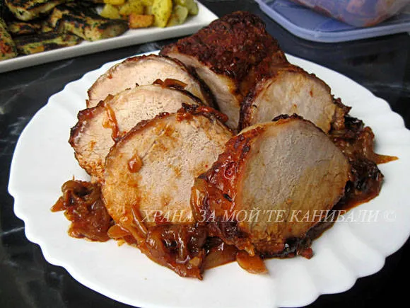 Вкусна класика! Може да се сервира с картофено пюре и още карамелизиран лук, заедно с гъбите, ако се поставят такива при печенето на филето.