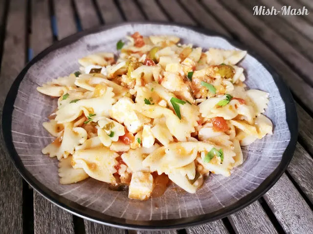 Салата или основно вегетарианско - изборът е ваш. От мен е рецептата за тази много вкусна паста с меко сирене, домати и маслини.