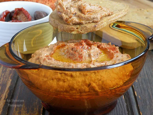 Веган пастет от червена леща със сушени домати и маслини